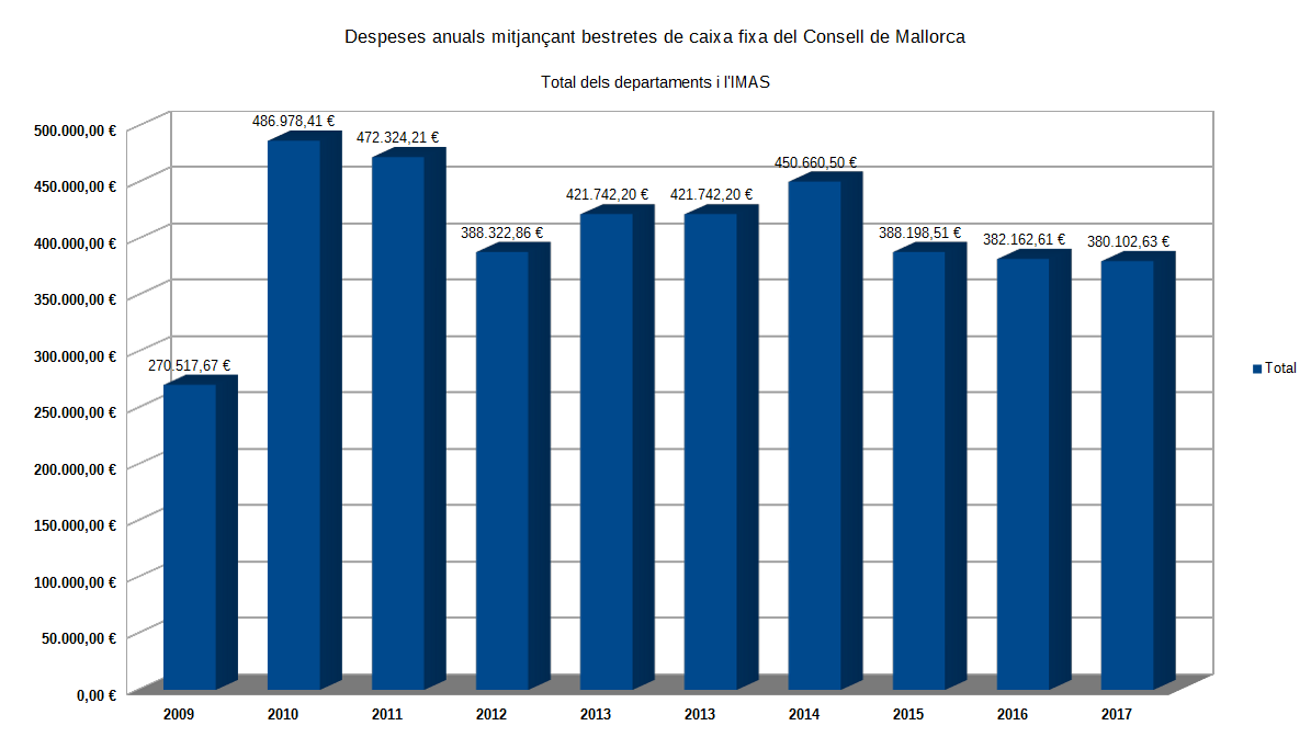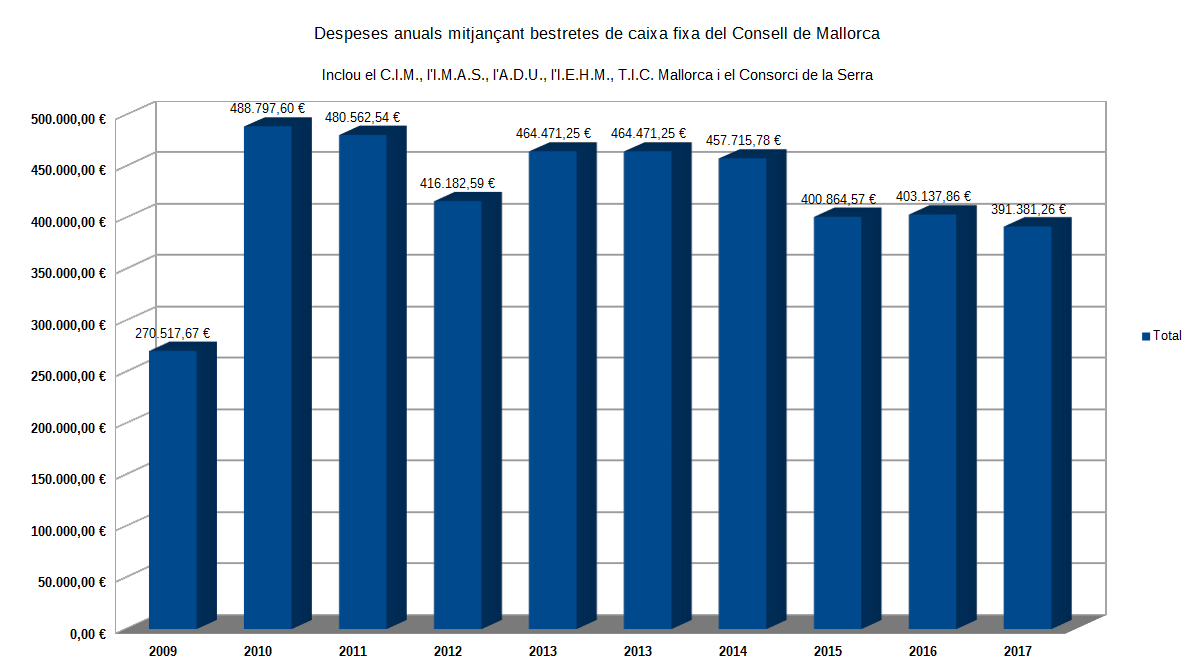 La Comisión de Transparencia del Consell Insular de Mallorca tiene pendiente la aprobación del "Procedimiento de publicación de los gastos de caja fija" que la Oficina de Transparencia ha preparado. En éste se determina que los datos crudos que servirán como base para producir los datos que se cargarán en este portal serán los justificantes de anticipo de caja fija, extraídos de la consulta general de justificantes del programa de contabilidad, en cualquier estado contable y situación diferente de "Anulado", con fecha de documento entre el 1 de enero y el 31 de diciembre del año en cuestión, del ejercicio en cuestión.